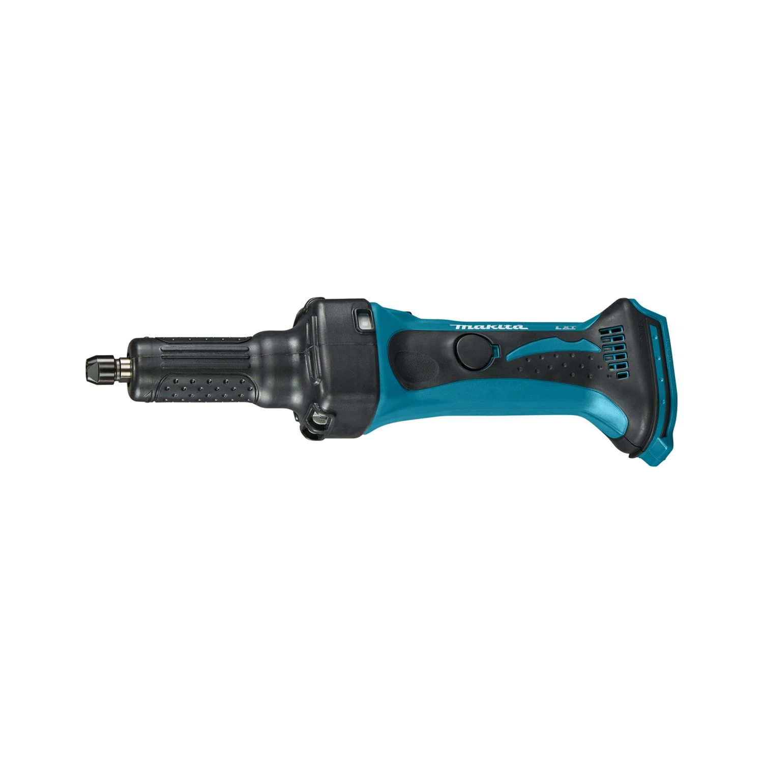 The Makita DGD800Z 18v LXT Die Grinder is a cordless tool with an ergonomic, easy-to-grip slim motor housing. It has a torque limiter, and is powered by an 18V Li-ion battery. It has a collet capacity of 6mm, and a no-load speed of 25000 rpm.
