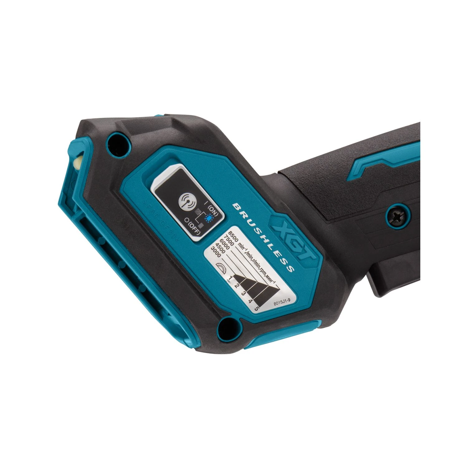 The Makita GA023G is a 125mm 40Vmax XGT Li-ion battery powered cordless angle grinder that delivers grinding and cutting power similar to 1000 watt class AC models. The brushless motor provides optimal efficiency and runtime from the 40Vmax battery. The grinder features Active Feedback Sensing Technology (AFT) which shuts down the tool if the rotation speed suddenly slows down. The 40Vmax range of grinders are designed to be able to continuously perform heavy-duty cutting and grinding.
