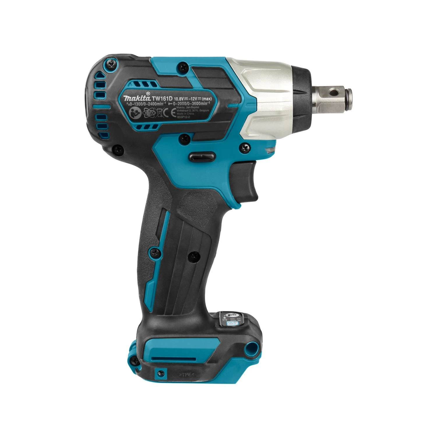 The Makita TW161DZ impact wrench delivers an impressive 165nm of fastening torque and up to 2, 400 rpm for a wide range of different applications. It is extremely compact and lightweight yet powerful thanks to its brushless motor and 2-stage impact power selection. The LED job light ensures maximum precision even in darker areas and the electric brake increases user safety.